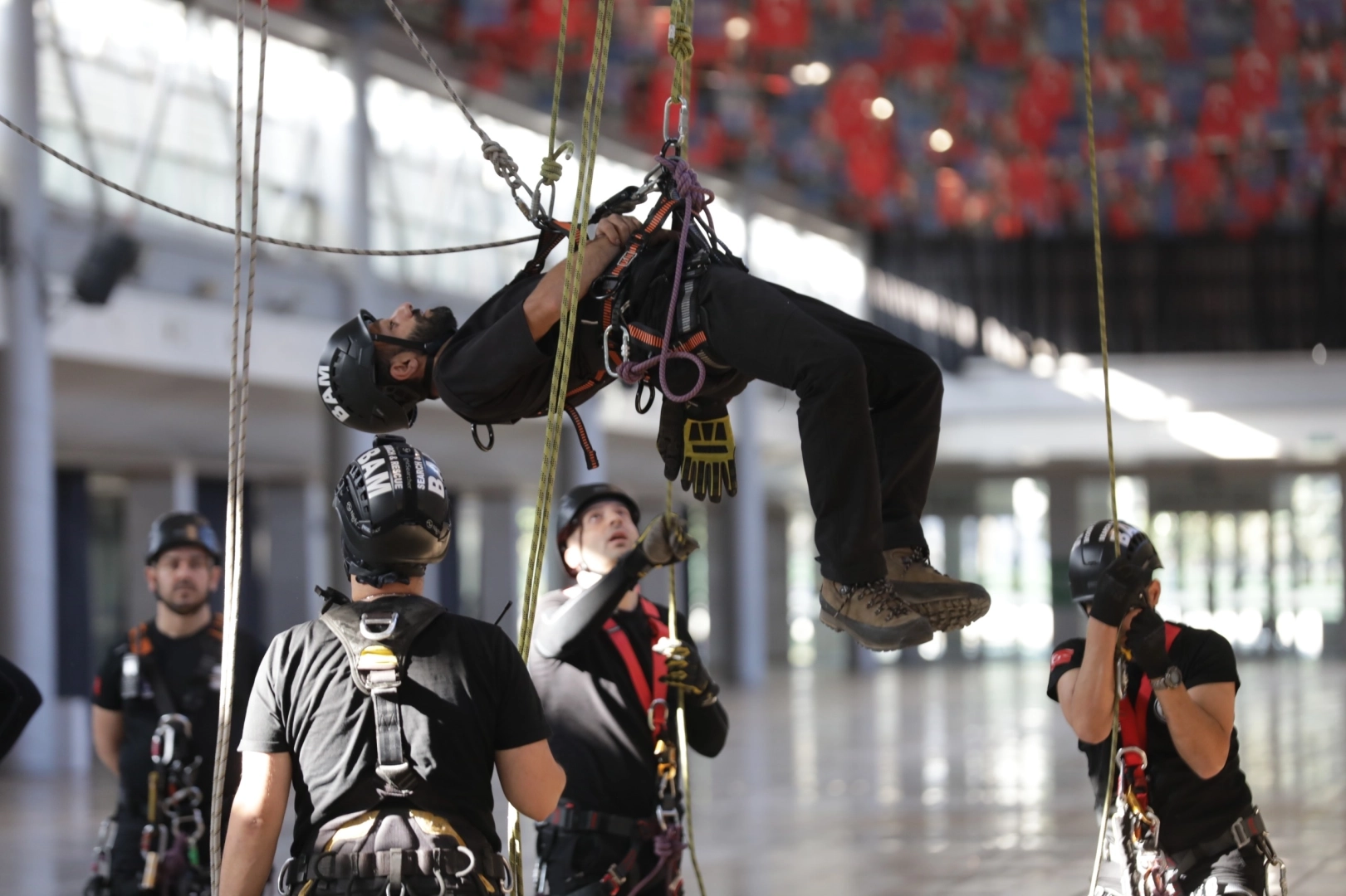 Merinos Yerleşkesi Fuaye Alanı’nda ‘İple Kurtarma Sistemleri ve Arama-Kurtarma eğitimi’ alan ekipler, uzman eğitmenler eşliğinde tavana asılı halatlara güvenlik ekipmanlarını kullanarak tırmandı.