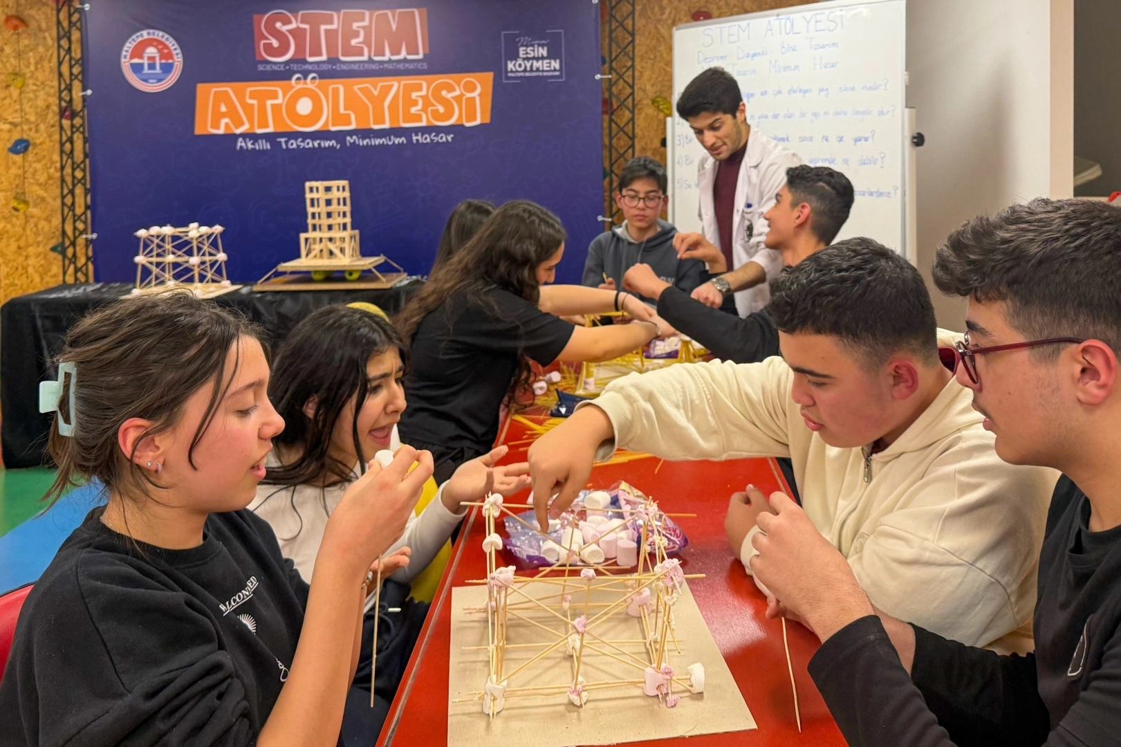 Etkinliğin ikinci aşamasında “Akıllı tasarım, minimum hasar” sloganıyla hayat bulan STEM (Bilim, Teknoloji, Mühendislik ve Matematik) Atölyesi’ne geçildi. Öğrenciler, Cumhuriyet Eğitim Merkezi Fen Bilimleri Öğretmeni Mustafa Tanyeli ve Matematik Öğretmeni Ali Şahan Avcı’yla bilim, teknoloji, mühendislik ve matematiğin bir bütün olarak ele alındığı farkındalık atölyesinde dayanıklı bir binanın teorik bilgilerini pratiğe döktü. Öğrenciler, makarna, şeker bazlı malzemelerin de bulunduğu malzemeler kullanarak dayanıklı bina modelleri inşa etti. Süreç boyunca kendilerine yöneltilen 5 kritik soruya yanıt arayan çocuklar; birlikte çalışmayı, takım ruhunu ve analitik düşünme becerilerini geliştirdi.