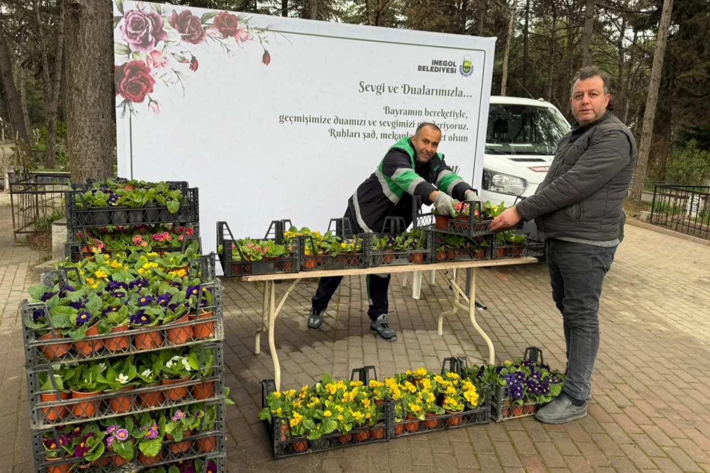İnegöl Belediyesi, Ramazan Bayramı arifesinde mezarlık ziyaretine gelen vatandaşlara ücretsiz 9 bin adet çiçek dağıtarak anlamlı bir uygulamayı bu yıl da sürdürdü.