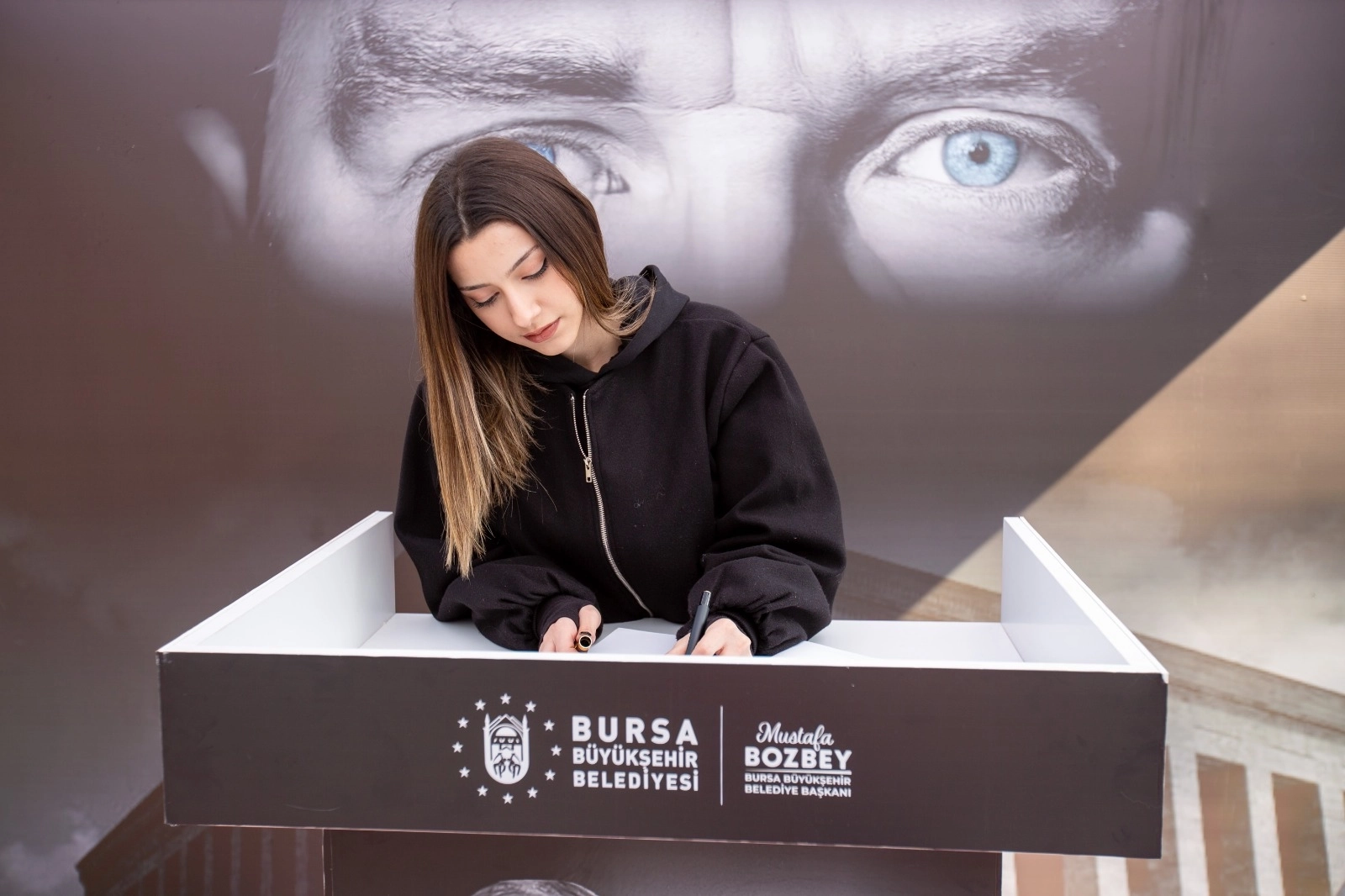 BURSA (İGFA) - Bursalılar, Ata’ya duydukları özlem ve sevgilerini Büyükşehir Belediyesi’nin kentin farklı noktalarına kurduğu anı defteri stantlarıyla satırlara döküyor.