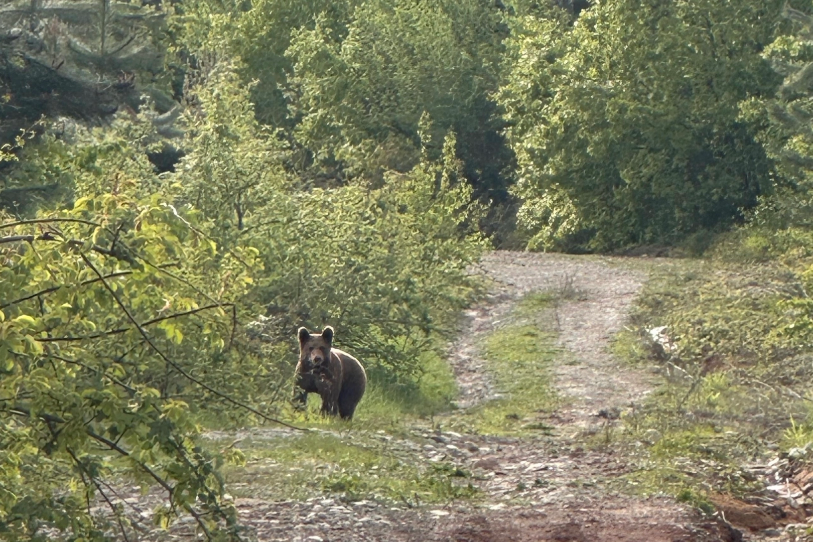 Kısa süre sonra ağaçların arasından çıkan, yaklaşık 2-3 aylık olduğu tahmin edilen yavru bir ayı, piknik alanına doğru ilerledi.