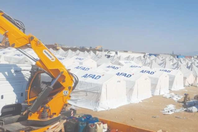 Kocaeli Büyükşehir Belediyesi’nin deprem bölgesi Hatay Defne’deki çadır kent ve sahra hastanesi çalışmaları aralıksız devam ediyor. Bir yandan alanların içme suyu ve kanalizasyon alt yapı çalışmaları devam ederken bir yandan da çadırlar kurulmaya başlandı. Sahra hastanesi için de konteynerler bölgeye getiriliyor. Bir haftadır Hatay’ın Defne ilçesinde bulunan Kocaeli Büyükşehir Belediye Başkanı Tahir Büyükakın da bir yandan ilçedeki depremzedelerle yakından ilgilenirken bir yandan da çadır kent ve sahra hastanesi çalışmalarının hızla tamamlanması için denetlemelerde bulunuyor. Hızlıca kurulumu yapılan çadır kente yerleşen depremzedeleri de ziyaret edene Başkan Büyükakın, ‘’Burada depremzedelerimizin yaşam koşullarını iyileştirecek tüm imkanları sağlayacağız’’ dedi.