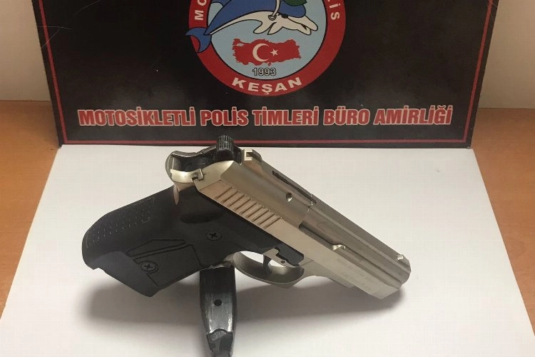 Erdoğan DEMİR / EDİRNE (İGFA) - Edirne'nin Keşan ilçesinde ekipler, durumundan şüphelendikleri bir aracı durdurarak sürücü V.Ç.'yi aradı. Aracın içerisinde yapılan aramada 1 adet kurusıkı tabanca ve tabancaya ait şarjör ele geçirildi.