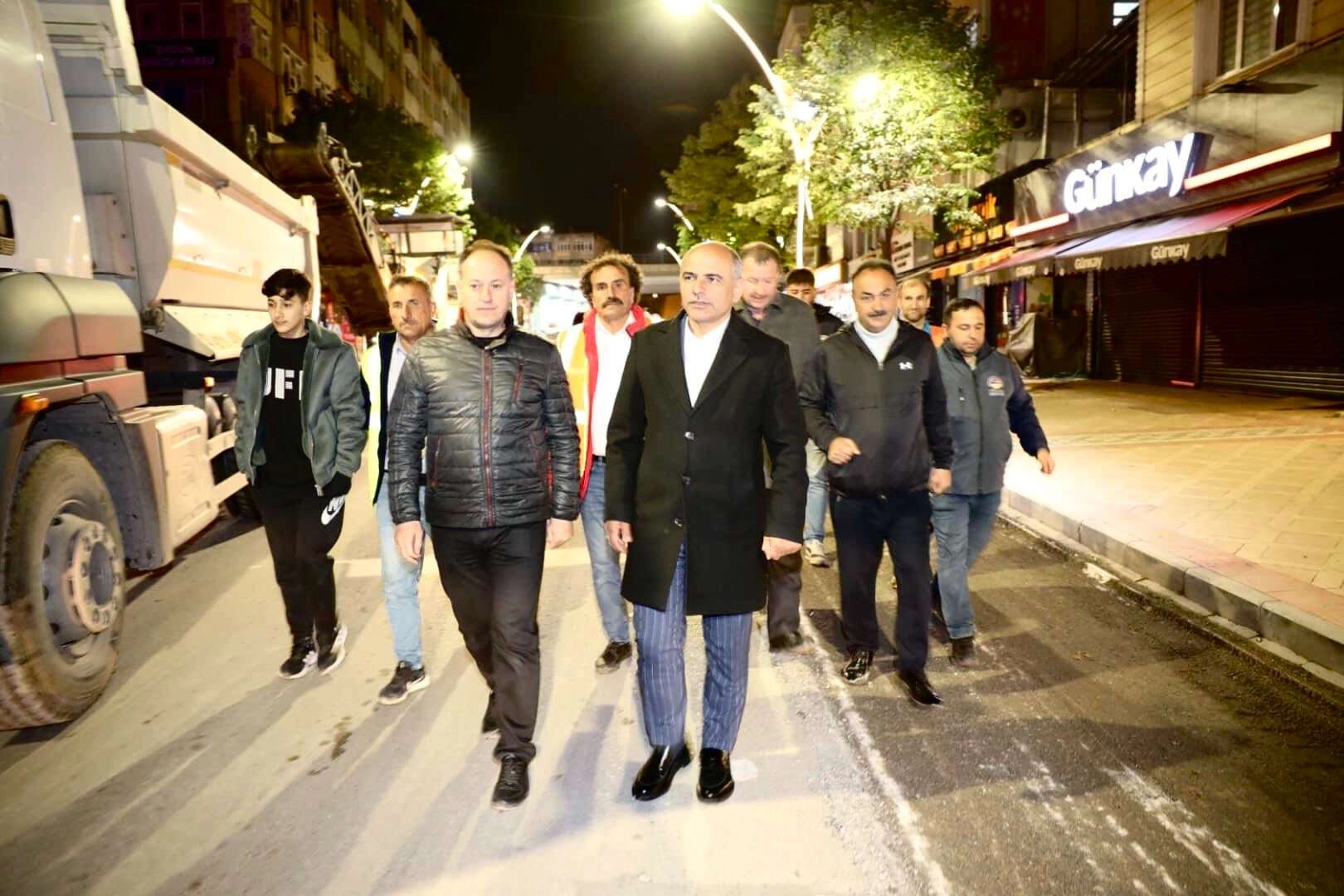 450 METRELİK YOL YENİLENDİ 450 metrelik Tuğrul Caddesi’nde önce mevcut asfaltın kazıma işlemi gerçekleştirildi. Hemen ardından da sıcak asfalt serimi için gece geç saatlerde çalışma başlatıldı. Eşref Bitlis Caddesi’nden Fetih Caddesi’ne kadar olan yolun asfaltlama çalışmalarını, Belediye Başkanı Şener Söğüt’te yerinde takip etti. Ekiplere kolaylıklar dileyen Söğüt, “ Çalışmaların tamamlanmasıyla caddemiz hem konforlu hem de daha güvenli hale gelecek. İlçemiz için gece gündüz demeden çalışmaya devam edeceğiz” dedi.