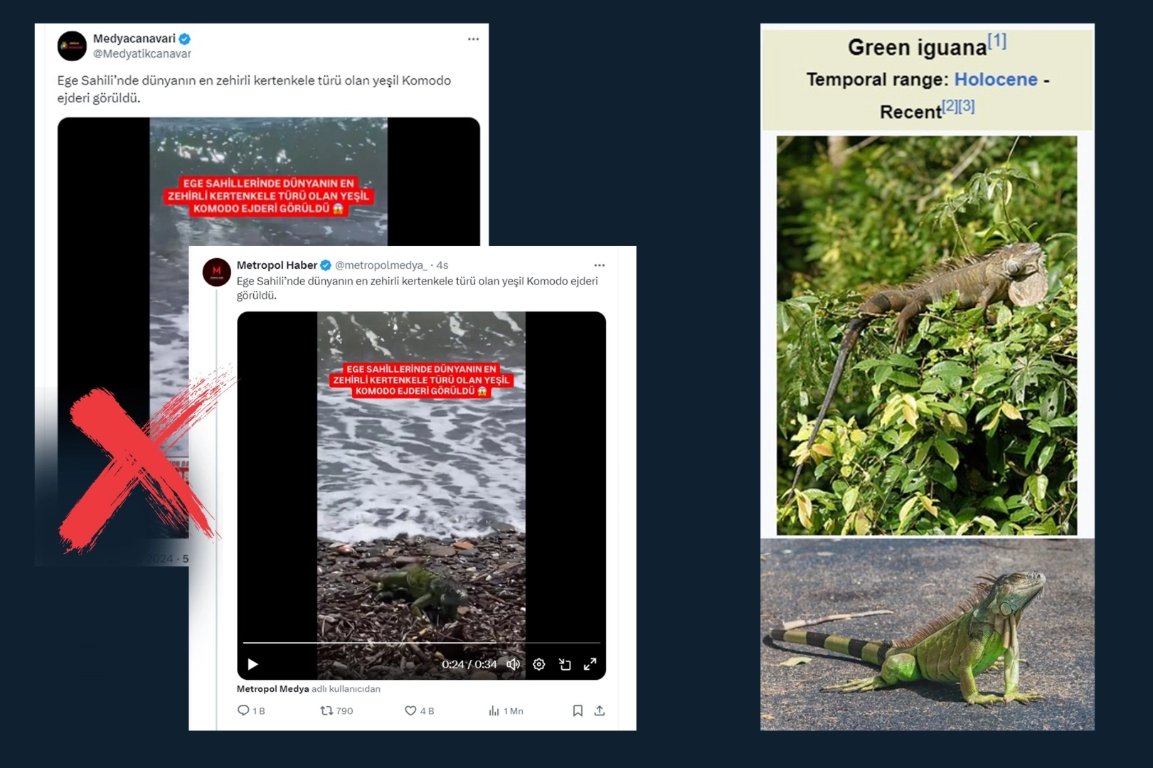 ANKARA (İGFA) - Bazı sosyal medya hesaplarından paylaşılan görüntülerle ilgili, "Ege Sahili’nde dünyanın en zehirli kertenkele türü olan yeşil Komodo ejderi görüldü." iddiası doğru olmadığı açıklandı.