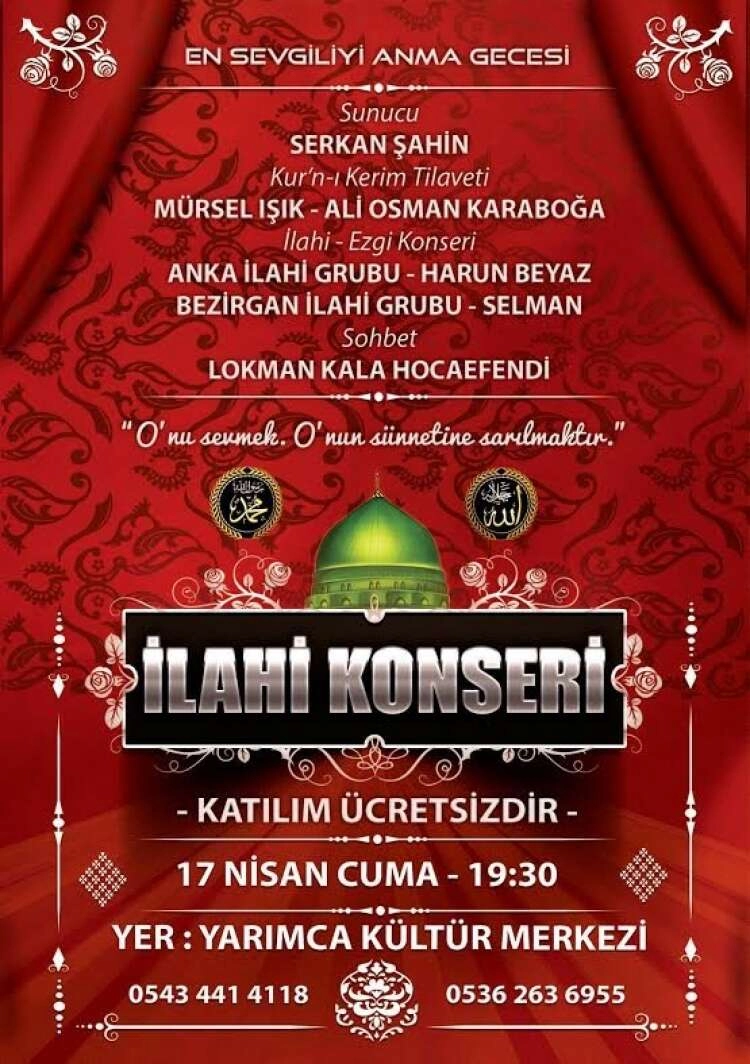 KOCAELİ’DE DEV İLAHİ KONSERİ İlahi Sanatçılarından Ücretsiz Halk Konseri Hazırlıkları yaklaşık 1 aydır süren "Dev İlahi Konseri" 17 Nisan Cuma akşamı saat 19.30’da Körfez Yarımca Kültür Merkezinde düzenlenecek. Tanınmış ilahi sanatçılarından Serkan Şahin, Harun Beyaz, Selman ve ilahileriyle ünlü Anka İlahi Grubu’nun yanı sıra Grup Bezirgan’ın sahne alacağı organizasyonun büyük ilgi görmesi bekleniyor. Sunuculuğunu Serkan Şahin’in yapacağı program, Hafız Ali Osman Karaboğa, Hafız Mürsel Işık ve Hafız Yakup Mevlüt Yıldız’ın Kur’an-ı Kerim tilavetiyle başlayacak. Sinevizyon gösterileri ve Semazen gösterileri ise programa ayrı bir görsel güzellik katacak. Şair ve Yazar Lokman Kala’nın ‘’Peygamber Efendimizi Anlamak’’ isimli konuşmasının ardından program dualarla son bulacak. Uzun süredir Kocaeli’de böyle büyük bir organizasyon ücretsiz olarak gerçekleştirilmemişti. Konseri tertipleyen İzmitli ilahi sanatçıları adına görüşlerini dile getiren Ahmet Kurt; ‘’Kocaeli’li vatandaşlarımıza muhteşem bir konser sunmak için uzun süredir hazırlık yapıyoruz. Dev sanatçı kadromuz ve Hafız kardeşlerimiz, Kocaeli halkıyla buluşacağı günü bekliyor. Ücretsiz olarak tertiplediğimiz bu konseri yapma amacımız stresli günler yaşayan halkımızı, kutlu doğum etkinliklerinin hızla devam ettiği şu günlerde manevi bir iklime sokmaktır. Kocaeli’li ilahi sanatçıları olarak, Allahın hoşnutluğunu kazanmak adına böyle bir konser düzenlemeyi uygun gördük. Bütün hemşerilerimizi 17 Nisan Cuma akşamı saat 19.30’da Körfez Yarımca Kültür Merkezine bekliyoruz.’’ Dedi.