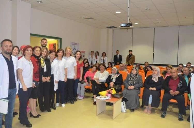 14 KASIM DÜNYA DİYABET GÜNÜ Kocaeli Üniversitesi Araştırma ve uygulama hastanesi 14 Kasım dünya diyabet günü nedeniyle diyabet hastalarına , hasta yakınlarına hastane çalışanlarına diyabetten nasıl korunuruz,diyabetle nasıl mücadele ederiz ve diyabet hastalarının dikkat etmesi gerekenler anlatıldı. Prof .Dr .Berrin Çetinarslan konuşmasında 14 Kasım Dünya Diyabet Günü her yıl diyabetle ilgili bir temanın altı çizilerek ,2018 yılı için ‘’Aile ve Diyabet’’teması ele alınıyor.Bunu vurgulamak amacıyla 2018 Dünya diyabet günü için ‘’Diyabet Her aileyi ilgilendirir’’ sloganı seçilmiştir.Diyabetin aileye etkisini vurgulamak,Diyabetin önlenmesi,Diyabetin Yönetiminde ailenin rolünü artırmak hakkında önemli bilgiler verildi.IDF tarafından verilen bilgiye göre her 6 saniyede bir kişi diyabet nedeni ile hayatını kaybetmektedir.542.000 çocuk tip 1 diyabetlidir dedi . Uz.dr. Emre Gezer hastaların diyabeti kabul etmesiyle ilgili sorunlar yaşandığını tedaviye geç başlanması nın sıklıkla görüldüğünü belirtti.Hastalarımız bu hastalıkla arkadaş olarak yaşamasını öğrenmeli hastalarımıza sadece verilen doğru ilaç ve tedaviyi kullanmaları gereklidir dedi diyabet hastalarından çok fazla oranda farklı aslında kendilerine uymayan kendi doktorları tarafından verilmeyen tedaviler kullanıldığına rastlandığını belirtti. Diyetisyen Uğur Öğüt hastaların kendilerine sadık kalmalarını verilen öğünlerin ve kalorilerinin gerçekten uygulanarak yapılması gerektiğini belirtti.Kaçamak yenilen gıdaların diyabeti daha fazla tetikliyerek aşılması zor durumlara sokacağını söyledi. Diyabet Hemşiresi Yeliz Demirhan ise hastalarımızın verilen egzersizleri yapmalarını rutin kontrollerini takip etmelerini kontrollere uyarak hastaneye gelmelerini belirtti.Diyabet hastalarının diyabet teşisinin koyulduğu tarihi mutlaka yazmaları gerektiğini belirtti. Prof .Dr. Zeynep Cantürk Hastalarımızın stresten uzak durmasını hasta yakınlarının onlara destek olarak diyetlerine ve tedavilere doğru uymalarının önemini vurguladı.Diyabette risk faktörleri hareketsiz yaşam tarzı,sağlıklı beslenme,şişmanlik,genetik yatkınlık olduğunu bir kez daha belirtti.