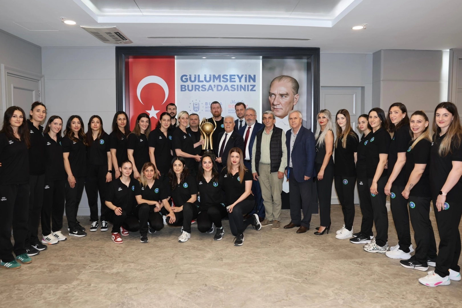 Tarihi bir başarıyla kupayı Bursa’ya kazandıran takım, şampiyonluk kupasıyla birlikte Bozbey ile bir araya geldi.