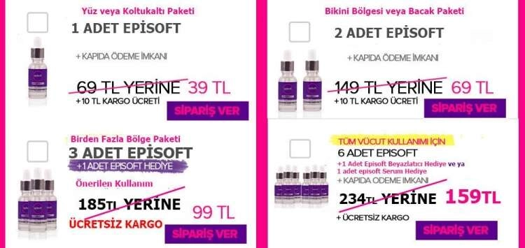 1 kutu Episoft serumun fiyatı 39 TL artı kargo bedelidir. Oldukça uygun fiyatlı olan bu üründe çoklu alımlarda sağlanan avantaj daha da artmaktadır. 2 kutu ürün 69 TL, 3 kutu ürün 99 ve 6 kutu ürün 159 TL’dir. Yani toplum alımlarda sürpriz hediyeler ve yüzde 50’ye varan indirimler uygulanmaktadır. Üstelik toplu alımlarda kargo bedeli istenmemektedir.