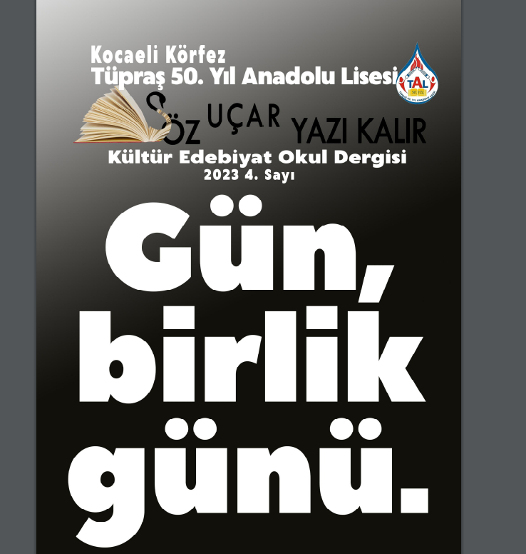 Okul Müdürü Veysel Okudan dergiyi "Okulumuz TÜPRAŞ 50.YIL ANADOLU LİSESİ öğretmen ve öğrencilerimiz tarafından hazırlanan Kültür Edebiyat Dergimiz SÖZ UÇAR YAZI KALIR 'ın 4.Sayısını (E Dergi) sizlerle paylaşmaktan, beğeninize sunmaktan onur duyarız. Veysel OKUDAN. Okul Müdürü" bu sözlerle paylaştı