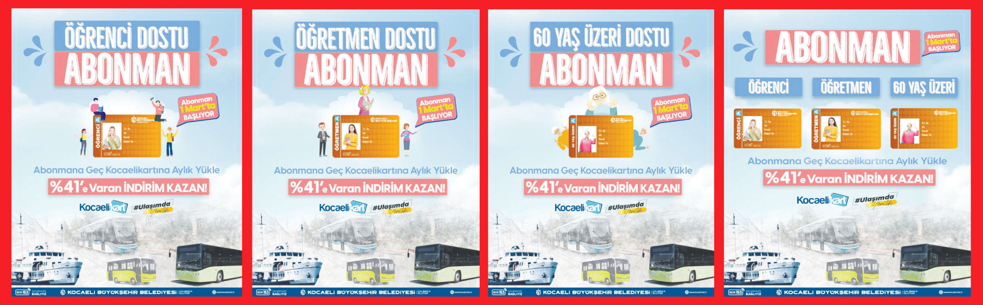 Ulaşımda birçok yeniliği gerçekleştiren Kocaeli Büyükşehir Belediyesi, şimdi de “Abonman İndirimli Kart” uygulamasını başlatıyor. Kocaeli’de bir ilk olan Abonman İndirimli Kartlar uygulamasından; Milli Eğitim Bakanlığı ve Yükseköğretim Kurumu sistemine kayıtlı olan öğrenciler, öğretmen ve 60 yaş üzerindeki vatandaşlar yararlanabilecek. Mart ayında başlayacak uygulama için abonman kart değişimleri başladı. Abonman indirimli karta geçenler %41’e varan indirimden faydalanacak.