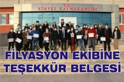 Körfez Sağlık Müdürlüğü'ne bağlı olarak filyasyon ekibinde başarılı bir şekilde vazife yapan görevlilere; Körfez Kaymakamlığı tarafından teşekkür belgesi verildi. Körfez Kaymakamı Sağlık İlçe Müdürlüğü tarafından kaymakamlıkta düzenlenen törenle; filyasyon ekibinde vazife yapan görevlilere teşekkür belgesi veren Sağlık Müdürü Oğuz Kösa, filyasyon ekibinde vazife yapanların birer kahraman olduğunu, herkesin hastalardan kaçtığı dönemde bunların bire bir hastalarla muhatap olduğunu söyledi. Zorlu süreçte önemli hizmetlere imza atan filyasyon ekibini kutladığını belirten Kösa, 'Bu ekipte vazife yapan görevlilere ne kadar teşekkür etsek azdır. Onlar gerçekten birer kahramandır." dedi. Teşekkür belgelerini alan filyasyon ekibinde ki vazifeliler, kendilerine takdim edilen bu belgelerin çok anlamlı olduğunu belirterek, "Hatırlanmak çok güzel bir duygudur. Bizleri hatırlayan ve yaptığımız görevin bilincinde olan herkese teşekkür ederiz' dediler.