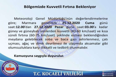 Meteoroloji Genel Müdürlüğü’nün değerlendirmelerine göre; Marmara genelinde 25.12.2020 Cuma günü saat:12.00’dan 27.12.2020 Pazar günü saat:03.00’a kadar güney ve güneybatı yönlerden kuvvetli (40-60 km/saat) ve kısa süreli fırtına (60-75 km/saat) şeklinde esmesi beklendiğinden meydana gelebilecek soba ve baca gazı zehirlenmesi, çatı uçması, ağaç ve direk devrilmesi ile ulaşımda aksamalar gibi olumsuzluklara karşı dikkatli ve tedbirli olunmalıdır.
