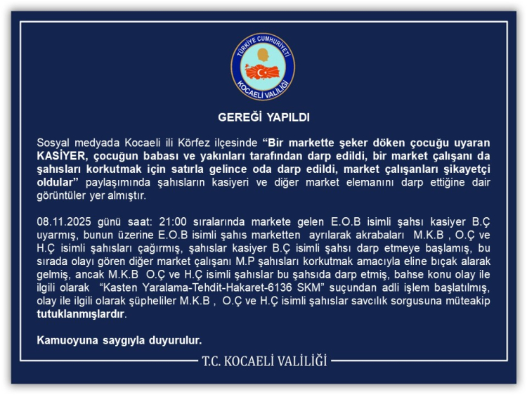 Sosyal medyada Kocaeli ili Körfez ilçesinde “Bir markette şeker döken çocuğu uyaran KASİYER, çocuğun babası ve yakınları tarafından darp edildi, bir market çalışanı da şahısları korkutmak için satırla gelince oda darp edildi, market çalışanları şikayetçi oldular” paylaşımında şahısların kasiyeri ve diğer market elemanını darp ettiğine dair görüntüler yer almıştır.