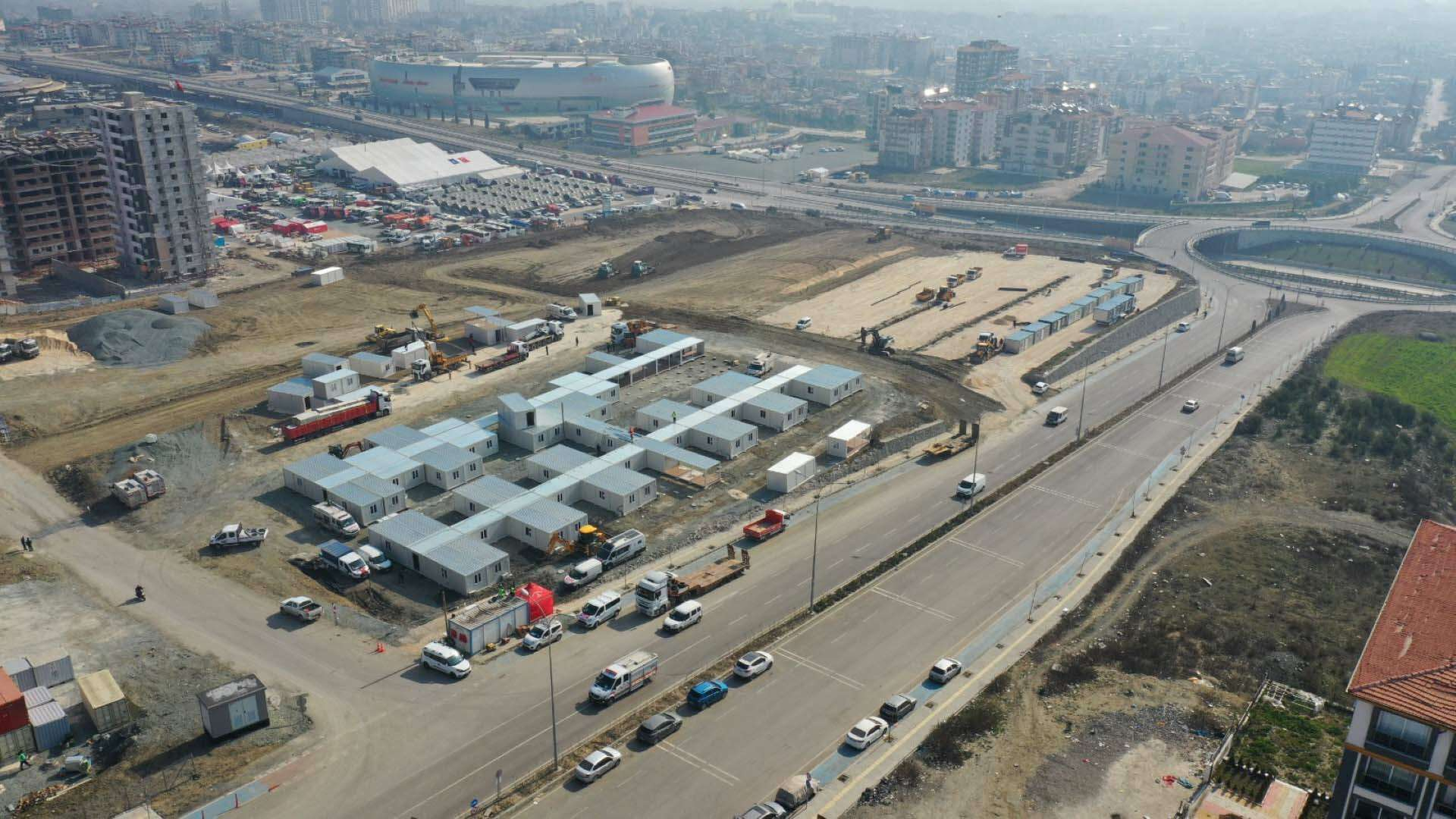 Hatay Defne’de çadır kentin kurulumunu tamamlayan Büyükşehir, konteyner kent ve hastane çalışmalarına gece gündüz devam ediyor