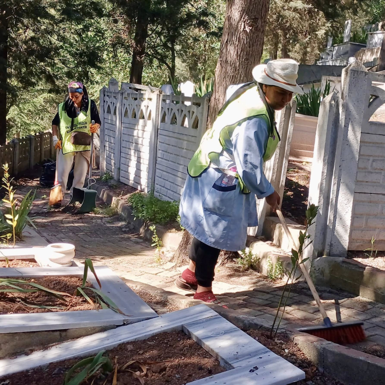 İlçe mezarlığında yetişen yabani otların, yer yer insan boyuna yaklaşması sebebiyle mezarlıklarda detaylı temizlik işlemi başlatıldı. Motorlu çim biçme makinesiyle temizlemeye başlayan ekipler, mezarların çevresindeki otları temizleyerek mezar ziyaretlerinde ve cenaze definlerinde sıkıntı yaşanmaması için çalışmalara devam edileceğini belirtti.
