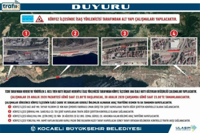 Bu kapsamda çalışma süresince Körfez ilçesi Hacı Akif Mahallesi Tayyar Yıldırım Caddesi'nin Nuh Çimento Fabrikası Liman girişinde trafik düzenlemesine gidilerek trafik diğer şeritten kontrollü olarak sağlanacak. Körfez ilçesi Şirinyalı Mahallesi Sahil Yolu Caddesi tek şerit kapatılarak trafik veya şeritten kapatılarak trafik diğer şeritten kontrollü olarak sağlanacak.