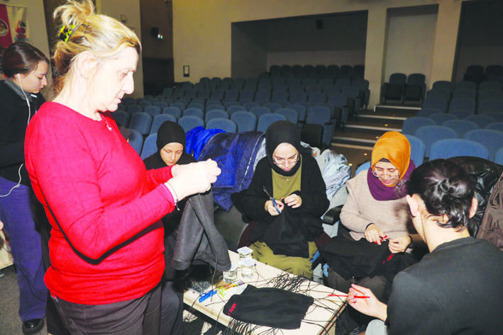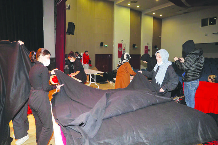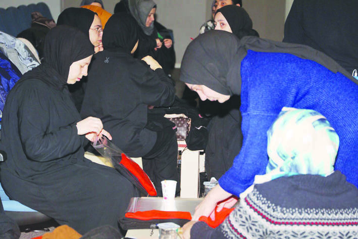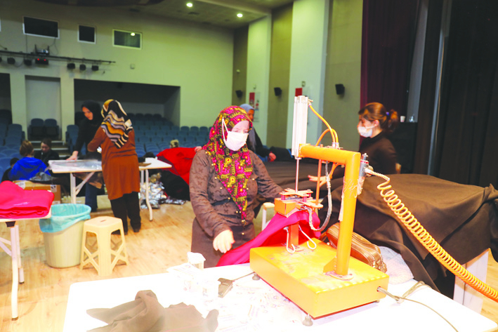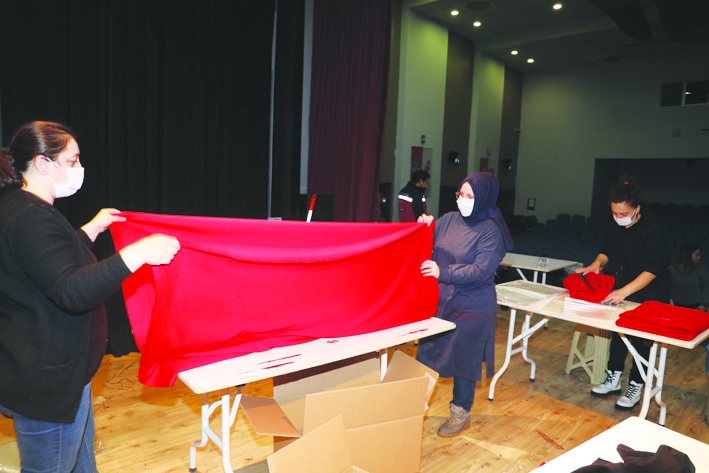 Bölgede en çok ihtiyaç duyulan battaniye, atkı ve bere gibi malzemelerin dikim ve kesim işlemlerinin yapıldığı alanda da tamamı gönüllü Körfezli bayanlar görev alıyor. Genci yaşlısı birçok kadının yardım için koştuğu alanda şu ana kadar 2 bin adet atkı, bere ve battaniye üretimi gerçekleştirildi.