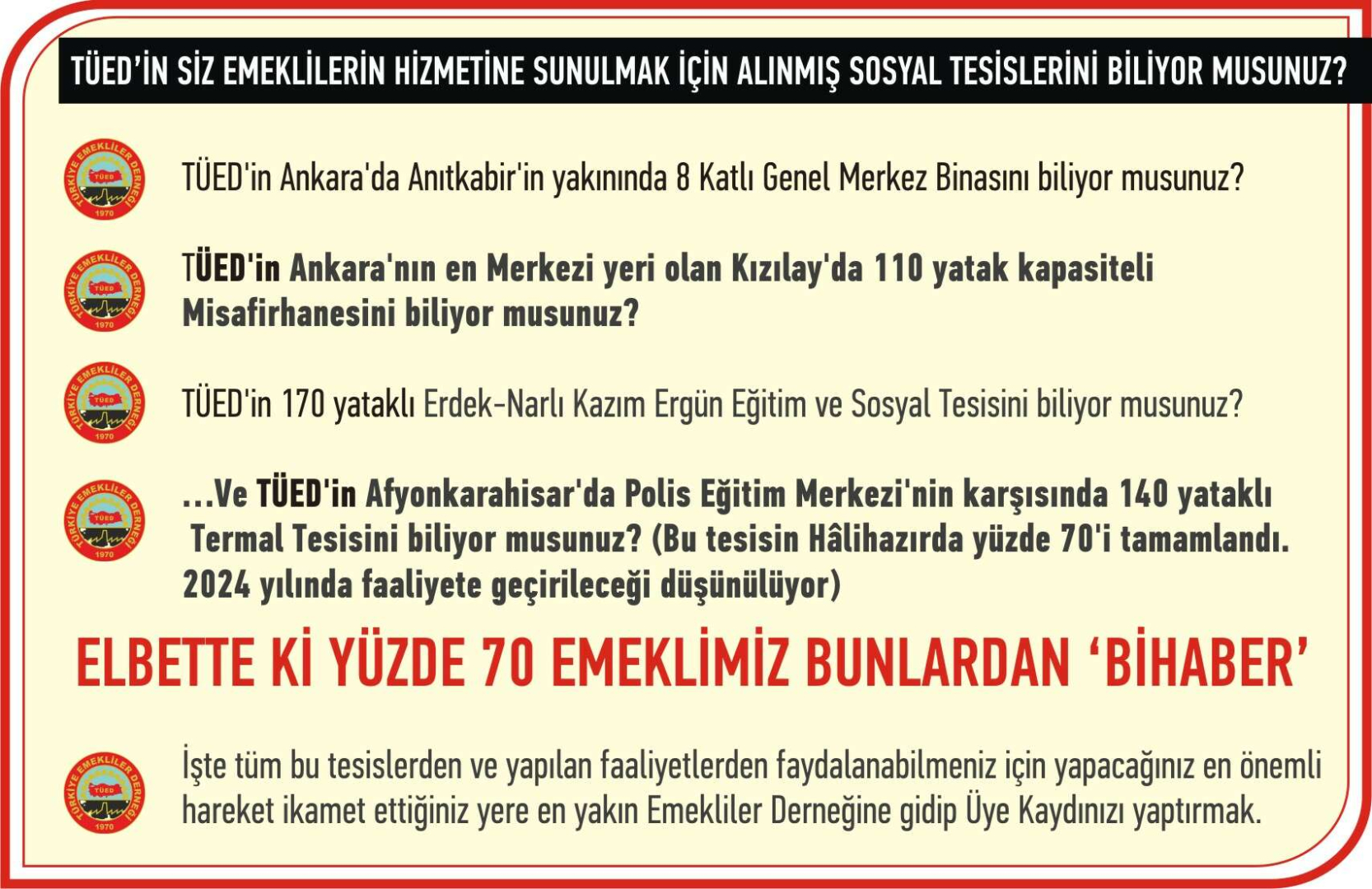 İşte tüm bu mükemmel hizmetler siz emekliler için sunulmuş. Bu imkânlardan faydalanabilmek tamamen sizlerin elinizde. Yapmanız gereken tek şey size en yakın Emekliler Derneği Şubesine başvurunuzu yaparak üye olmanızdır. Üyelik aidatı şimdilik yılda bir sefer maaşınızdan kesilmek üzere alınan 60 liradır. Yanlış okumadınız Sadece ve Sadece yıllık 60 TL. Bu üyelik ile TÜED’in sizlere sunduğu tüm imkânlardan faydalanabilme imkânına sahip olacaksınız.