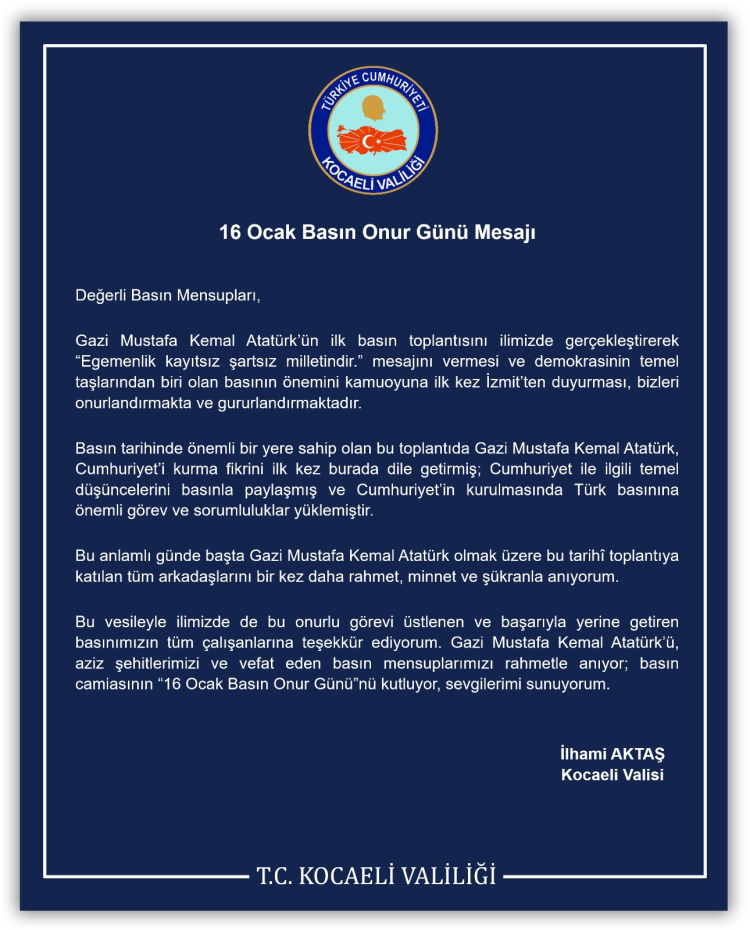 Bu vesileyle ilimizde de bu onurlu görevi üstlenen ve başarıyla yerine getiren basınımızın tüm çalışanlarına teşekkür ediyorum. Gazi Mustafa Kemal Atatürk’ü, aziz şehitlerimizi ve vefat eden basın mensuplarımızı rahmetle anıyor; basın camiasının “16 Ocak Basın Onur Günü”nü kutluyor, sevgilerimi sunuyorum.