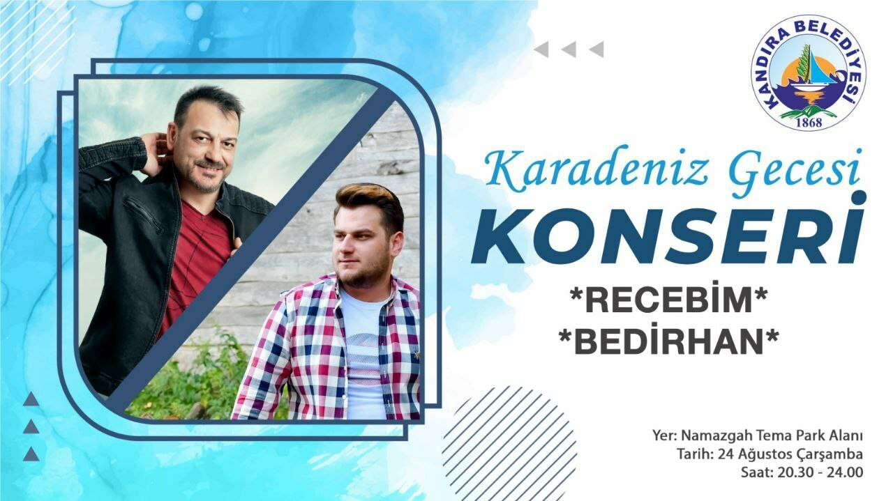 Kandıra Belediyesi Kültür Günleri kapsamında düzenlenen Karadeniz'in sevilen sesi Recebim ile Karadeniz'in genç başarılı sesi Bedirhan Konseri Kandıra’yı sallayacak. 24 Ağustos Çarşamba günü 20:30 – 24:00 saatleri arasında Kandıra Namazgah Tema Park Alanında açık hava konseri olarak gerçekleştirilecek program için daha şimdiden heyecan dorukta.