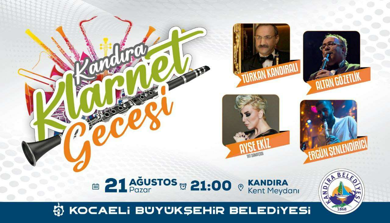 Ünlü Klarnet Virtüözü Türkan Kandıralı ve usta klarnet virtüözleri Altan Gözetlik, Ergün Şenlendirici ve TRT Sanatçısı Ayşe Ekiz eşsiz reperatuarları ile 21 Agustos Pazar günü saat 21:00’de Kandıra Kent Meydanında gerçekleştirilecek ‘’Kandıra Klarnet Gecesi’’ programında Kandıralılara unutulmaz bir gece yaşatacak.