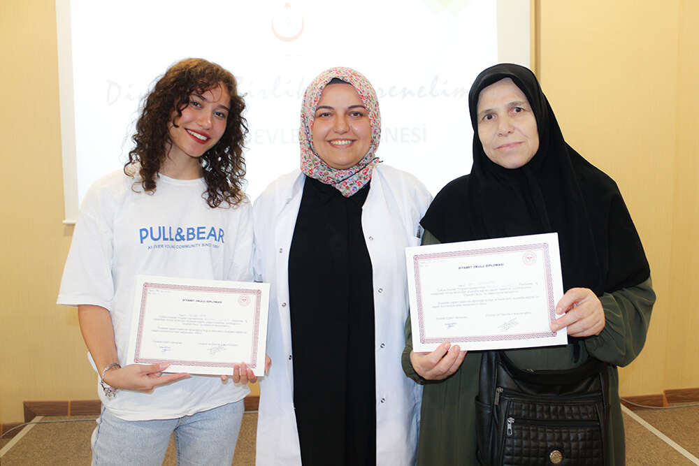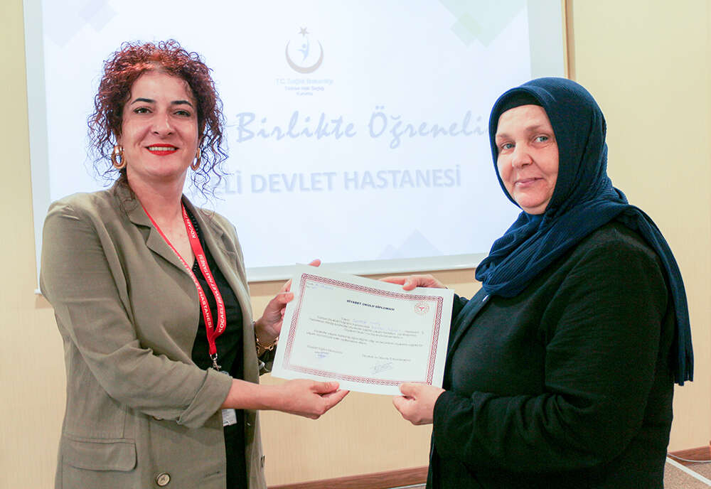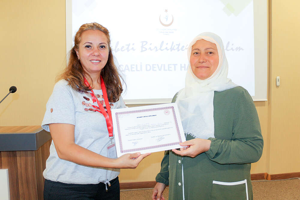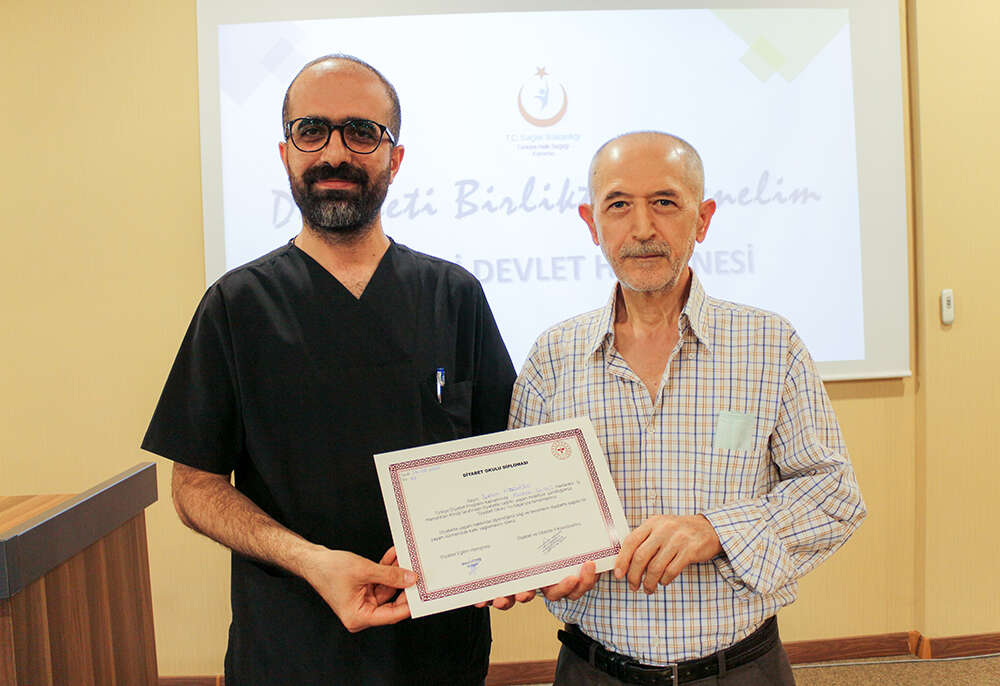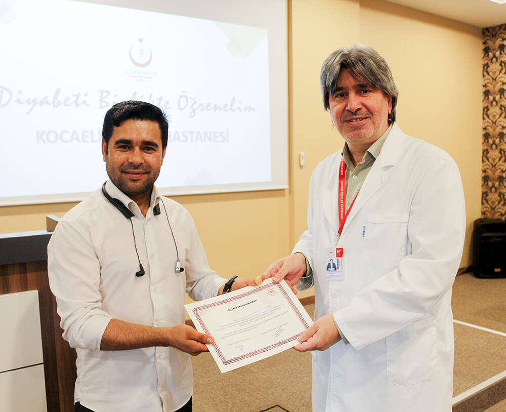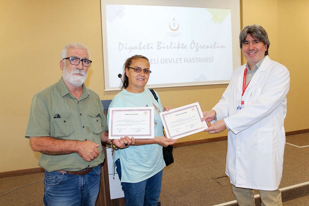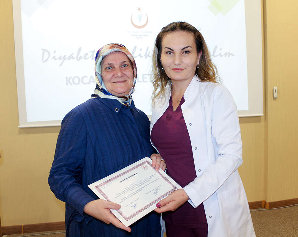 Eğitime katılan diyabetli bireylere ve yakınlarına, Kocaeli Devlet Hastanesi Başhekimi Uz. Dr. Adem Çakır, Başhekim Yardımcısı Uz. Dr. Nurcan Çubukçu, Sağlık Bakım Hizmetleri Müdürü Emine Ataman, Sağlık Bakım Hizmetleri Müdür Yardımcıları Abdurrahman Çelik ve Pınar Mermer ile Diyabet Hemşiresi Seher Güneş tarafından belge takdim edildi.