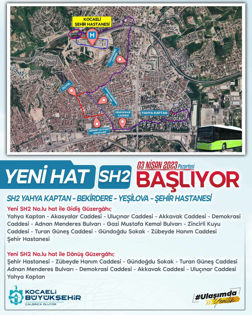 İzmit Yahya Kaptan Mah.-Yenişehir Mah.- Mehmet Ali Paşa Mah.- Bekirdere Mah.-Tavşantepe Mah. - Yeşilova Mahallesi – Şehir Hastanesi. SH2 hattı ile Yeşilova, Tavşantepe, Şirinevler, Bekirdere bölgelerinin Yahya Kaptan Mahallesi ile entegrasyonu sağlanarak, Yahya Kaptan Mahallesindeki okullarda eğitim öğretim görmekte olan öğrencilerin tek vasıta ile toplu taşıma hizmeti sağlanmış olacak.