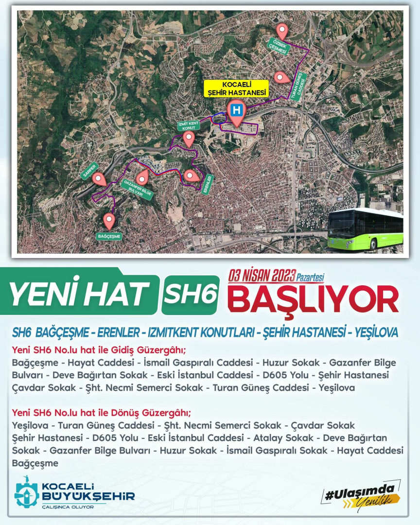 İzmit Orhan Mahallesi-Turgut Mah.- Erenler Mah. - Cedit Mah. - 28 Haziran Mahallerinden Şehir Hastanesi ve Yeşilova bölgesine erişimin sağlanması için hizmet verilecek. Ayrıca SH6 Hattı ile 28 Haziran, Cedit, Erenler Mahallelerinde ikamet eden öğrencilerin, Orhan Mahallesinde bulunan Tevfik Sena Arda Lisesine tek vasıta ile toplu ulaşım hizmeti sağlanacak. SH6 Hat araçları ile 43-44-51-53 no.lu Hat araçları arasında ücretsiz aktarmalı toplu taşıma hizmeti verilecek.