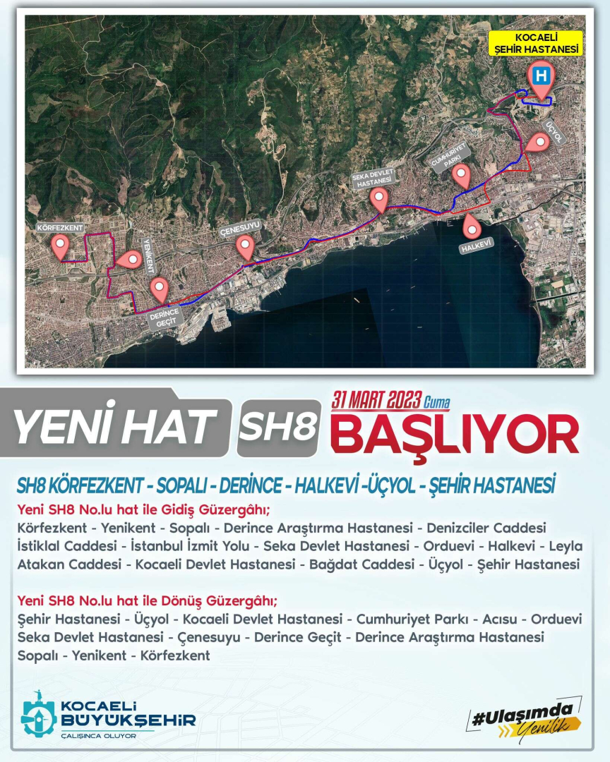 Körfezkent – Yenikent - Sopalı- Derince bölgesindeki vatandaşların Şehir Hastanesi erişimin sağlanması için SH8 hattı kuruldu. Ayrıca Sopalı Araştırma Hastanesi – Seka Devlet Hastanesi – Kocaeli Devlet Hastanesi’nden SH8 hattı ile Şehir Hastanesine direkt ulaşım sağlanacak.