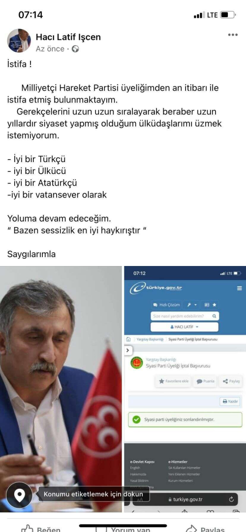 Hacı Latif İşçen, listelere tepki göstererek MHP üyeliğinden istifasını verdi. ‘İstifa gerekçemi uzun uzun sıralarım ama bazen sessizlik en iyi haykırıştır’ dedi.