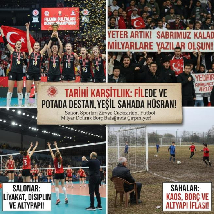 Türkiye’de sporun iki yüzü var: Bir yanda imkansızlıklar içinde dünya devlerini deviren VOLEYBOL ve BASKETBOLUN aslanları, diğer yanda ise halkın cebinden çıkan milyarları menejerlerin banka hesaplarına akıtan TÜRK FUTBOLUNUN FİYASKOLARI. Artık “futbol ülkesiyiz” masalını bir kenara bırakalım; biz bir “futbol hastasıyız” ama bu hastalık bizi içeriden çürütüyor.